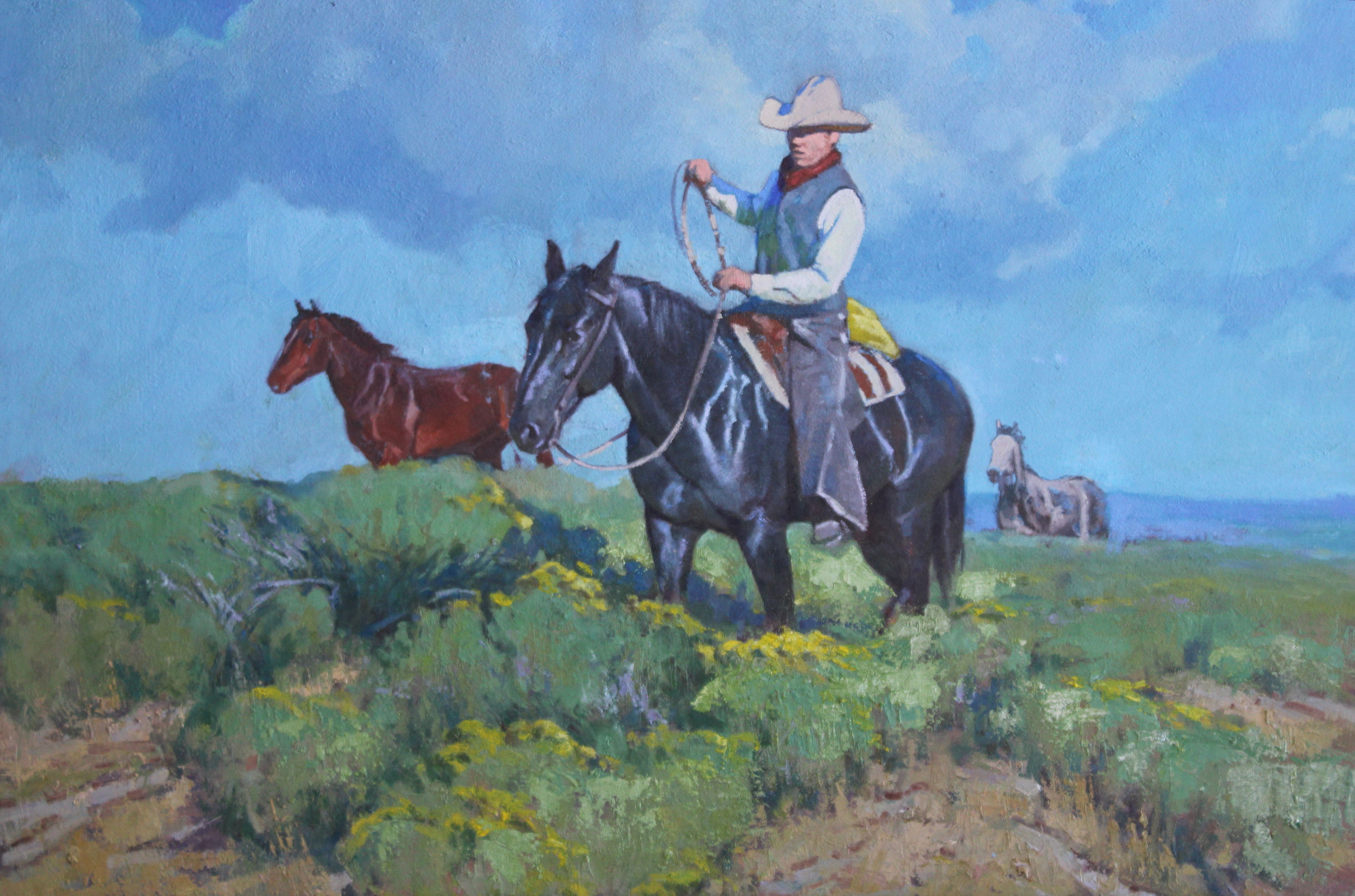 Although his work may combine horses, cowboys and landscapes, his works are often like portraits. A glimpse of a situation experienced by a solitary figure. One of his favorite activities as a young teenager was to check on the cattle up the canyon. He would spend the afternoon alone exploring canyons and streams on horseback.
